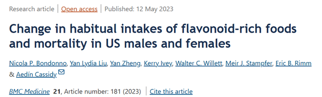 3、 Bondonno, N.P., Liu, Y.L., Zheng, Y. et al. Change in habitual intakes of flavonoid-rich foods and mortality in US males and females. BMC Med 2023. Doi:10.1186/s12916-023-02873-z